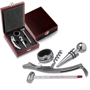 Conjunto de vinho apresentado em estojo de madeira com argola antigotas, termómetro, rolha e saca-rolhas. Colors : castanho Materials : Aço Inoxidável/Zinco/EVA/MDF Certificates : Cadmium (nr 2), PAHs (nr 4), 2013/2/EU (nr 11), Phthalates (nr 13), AZO Dyes/Amines (nr 18), SVHCs (nr 22), Food Safe (nr 186), BSCI (nr 195).Ø 18.5 x 15.5 x 5.5 cm / CASTANHO;